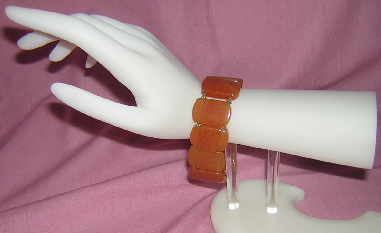 Sleek stretch bracelet made from oversized carnelian flat beads and silvertone accents.