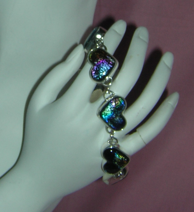 Rainbows of color burst from each sterling silver encased heart. Dichroic glass is hand blown and infused with a spectrum of eye-popping colors.