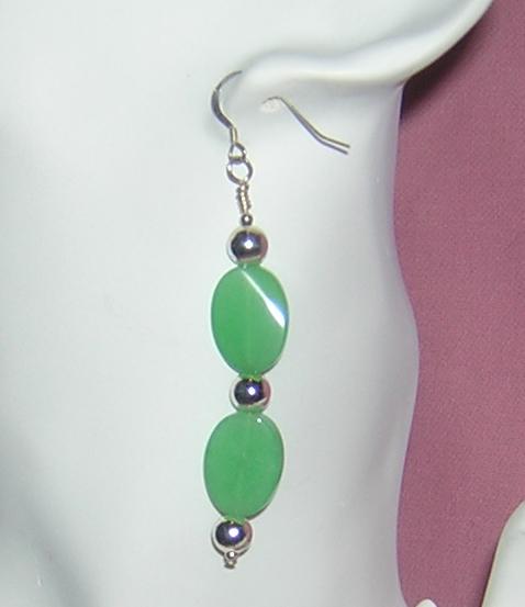 Keep them guessing with these unusual green quartz earrings. Two puffed oval glass beads with silver plated round accents. Sterling silver ear hooks.