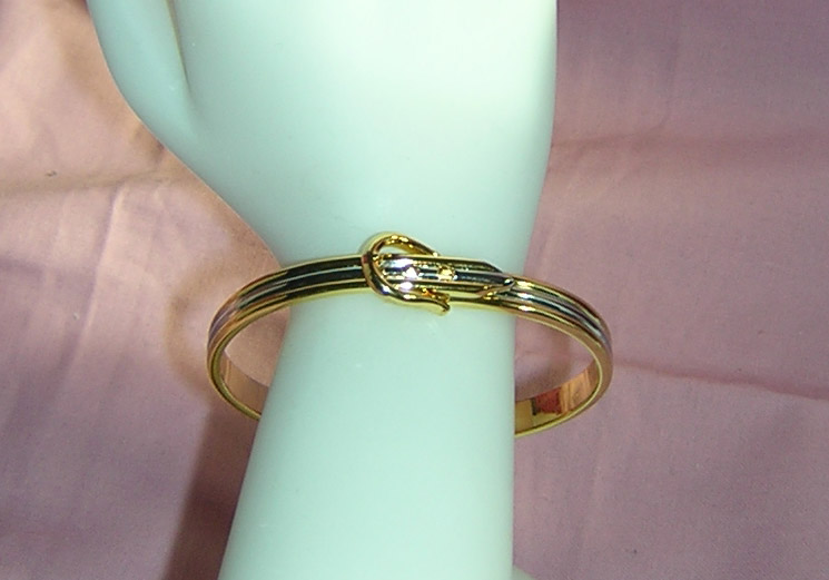 Gold and silver plated bangle bracelet with a functional buckle.