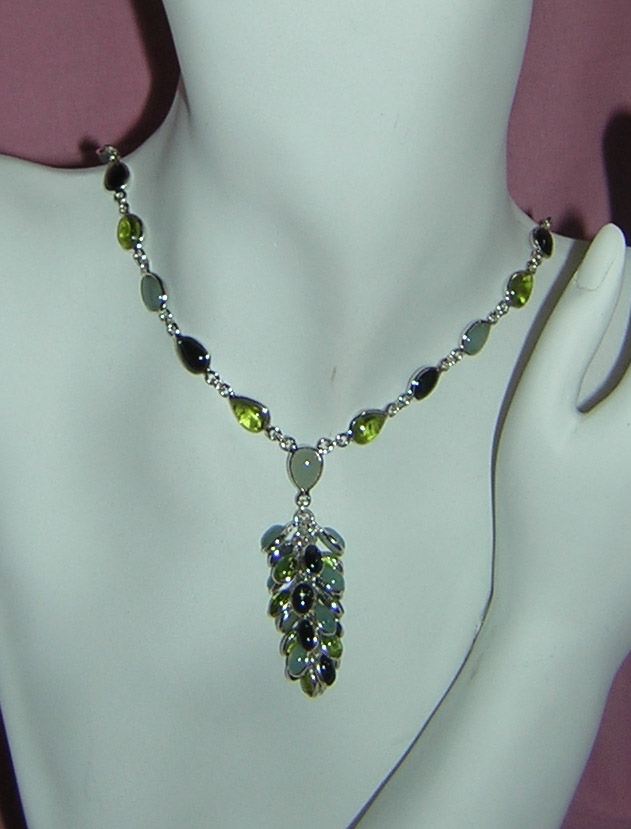This necklace adds the unusual element of surprise with a cascading drop of gemstone beads. Gemstones include amazonite, peridot, and smoky quartz.