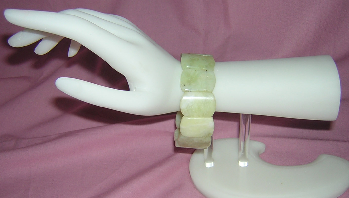 Sleek stretch bracelet made from oversized serpentine flat slab beads.