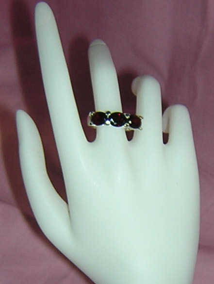 Three stone eternity band with faceted garnets are sure to keep your love red hot for many years to come. Stones are set in sterling silver.