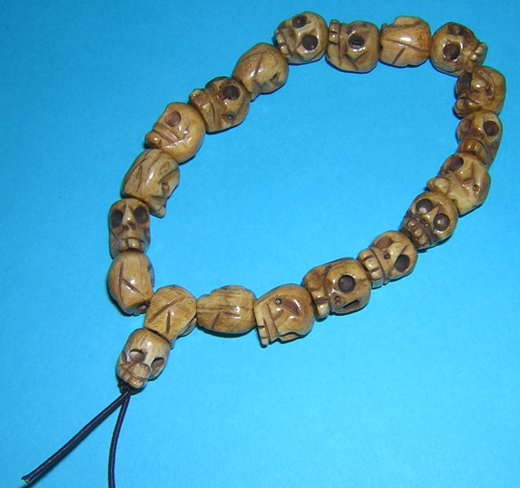 One of the hottest trends for fall 2005! 20 carved bone beads in the shape of skulls make up this un-expectantly chic stretch bracelet.