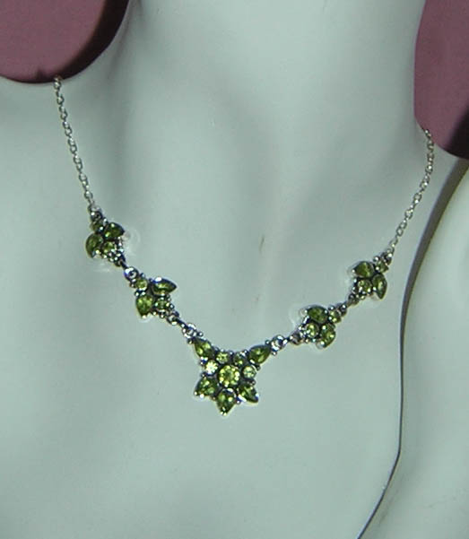 Sterling silver necklace with peridot gemstone floral accents. This necklace is also available in garnet red.