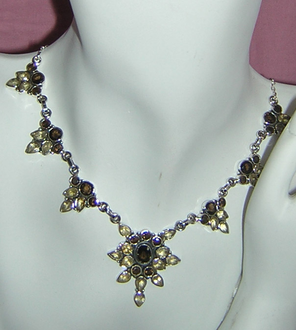 Sterling silver gemstone necklace with a myriad of citrine and smoky topaz faceted gemstones. A truly stunning masterpiece.