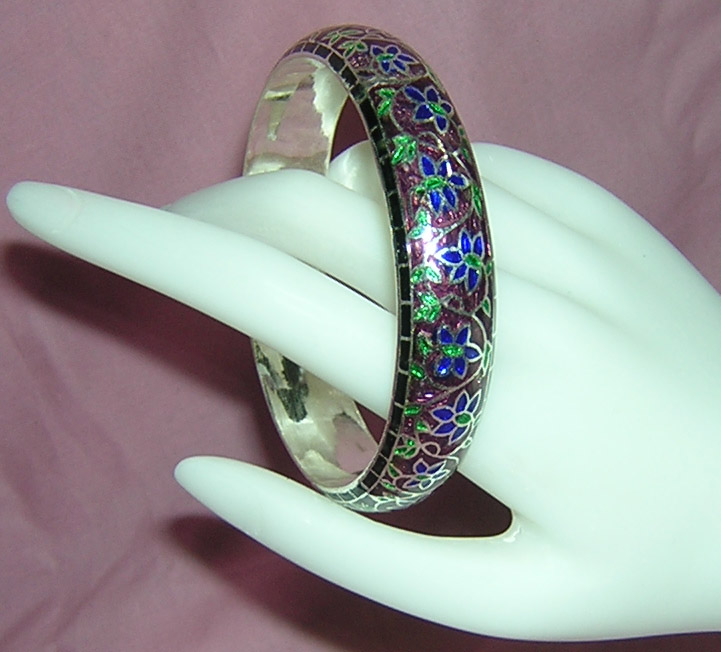 Oversized sterling silver bangle bracelet with a Tiffany Lamp styled floral motif set in bright enamel color.